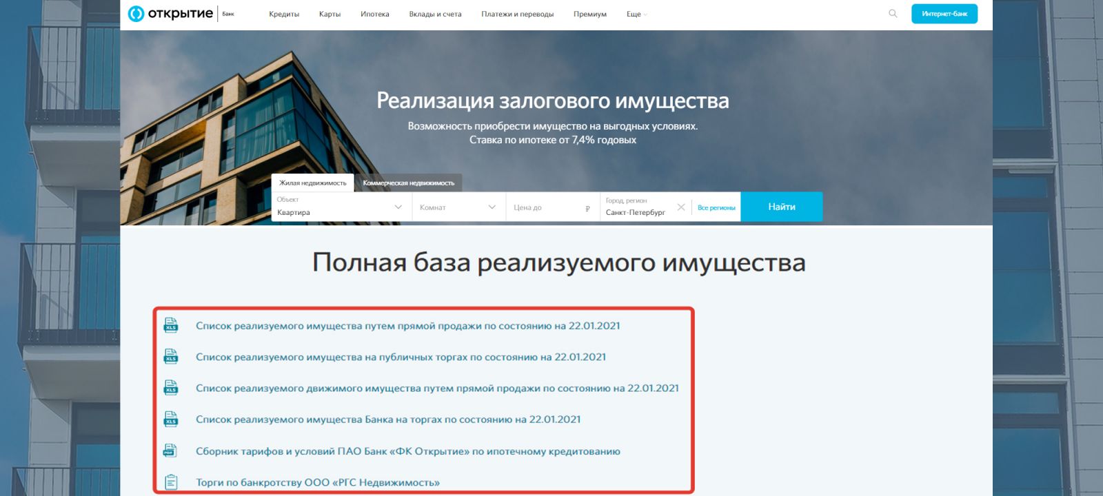 Сведения об объектах, подлежащих реализации, опубликованы на официальном сайте банка. Они отражены в разделе «Залоговое имущество», ссылка на который имеется в нижней части главной страницы. Информация представлена в виде таблиц формата Microsoft Excel.